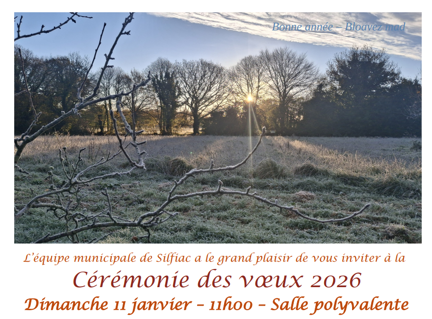 L’équipe municipale de Silfiac a le grand plaisir de vous inviter à la cérémonie des voeux pour cette nouvelle année 2026